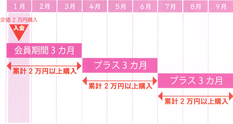 期間中(3ヶ月間)に、累計2万円以上購入すると、次の3ヶ月間延長され継続できます。 -
